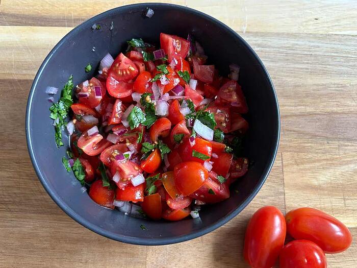 - Feldsalat, Apfelscheiben, Zwiebelstreifen und Minze hinzugeben, alles miteinander vermengen und abschmecken.
