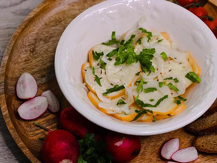 - Essig mit 5 EL Wasser, einer Prise Zucker, Kümmel, Salz und Pfeffer verrühren. Öl unterrühren und die Zwiebeln in die Mischung hineingeben.