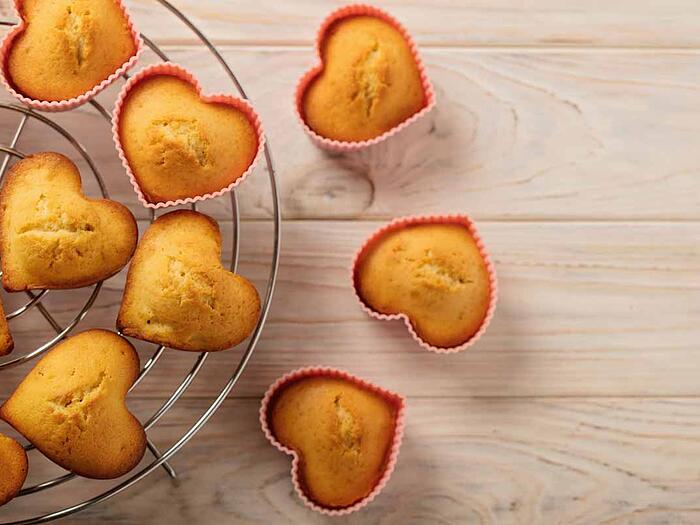 - Backofen auf 180 °C Ober-/Unterhitze (oder 160 °C Umluft) vorheizen. Eine Muffinform mit Papierförmchen auslegen oder gut einfetten. Tipp: Wer keine herzförmigen Förmchen hat, kann aus Alufolie kleine Kugeln formen und diese zwischen Papierförmchen und Muffinblechrand legen - so entsteht beim Backen eine Herzform.