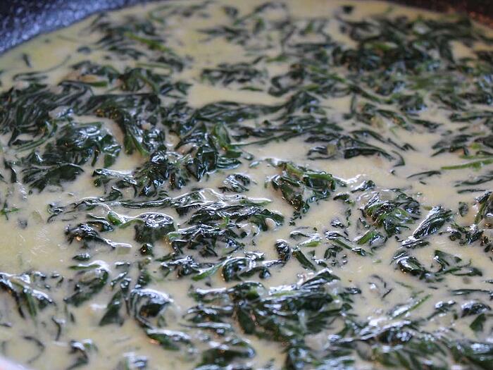 - Öl oder Butter in einer Pfanne erhitzen. Zwiebeln und Knoblauch andünsten, bis sie glasig sind und anschließend den Spinat hinzugeben. Alles für wenige Minuten dünsten lassen und mit der Sahne ablöschen.