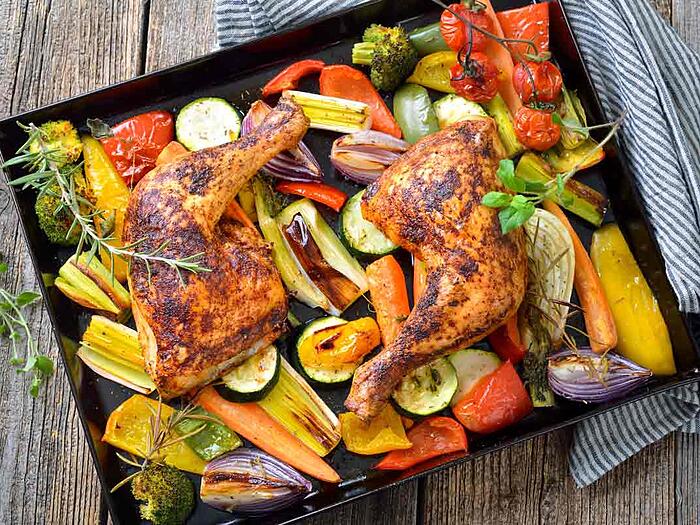 Gebackene Hähnchenkeulen mit Ofengemüse