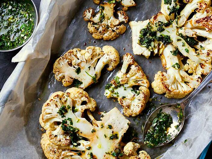 - Das Pesto gemeinsam mit dem fertig gebackenen Blumenkohl servieren.