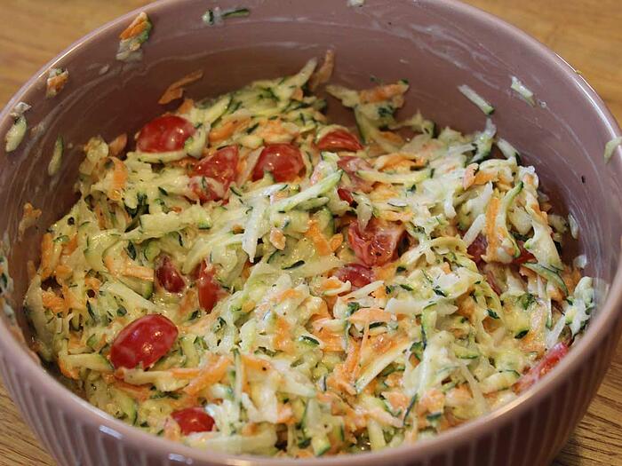 - Das Gemüse waschen. Den Kohlrabi und die Möhren schälen. Das Gemüse raspeln, die Tomate achteln und alles in eine große Schüssel geben.