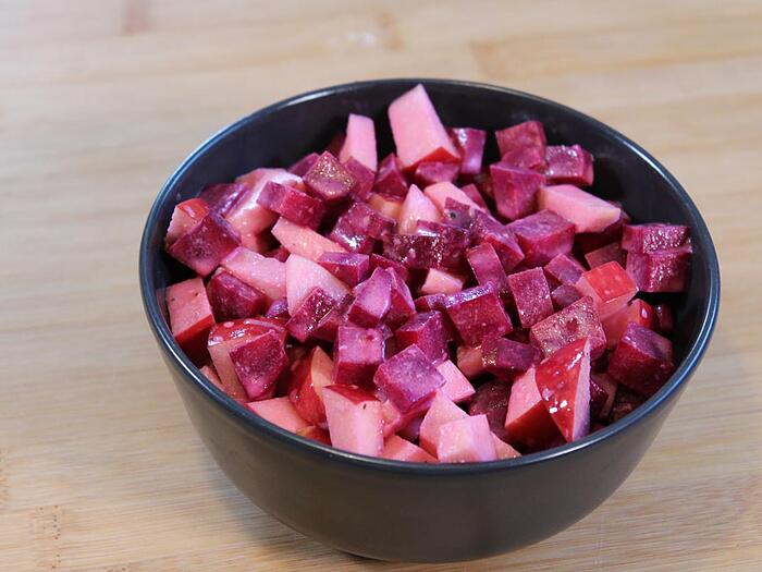 - Den Apfel entkernen und in gleich große Stücke schneiden und mit den Rote Bete Stücken in eine Schüssel geben.
