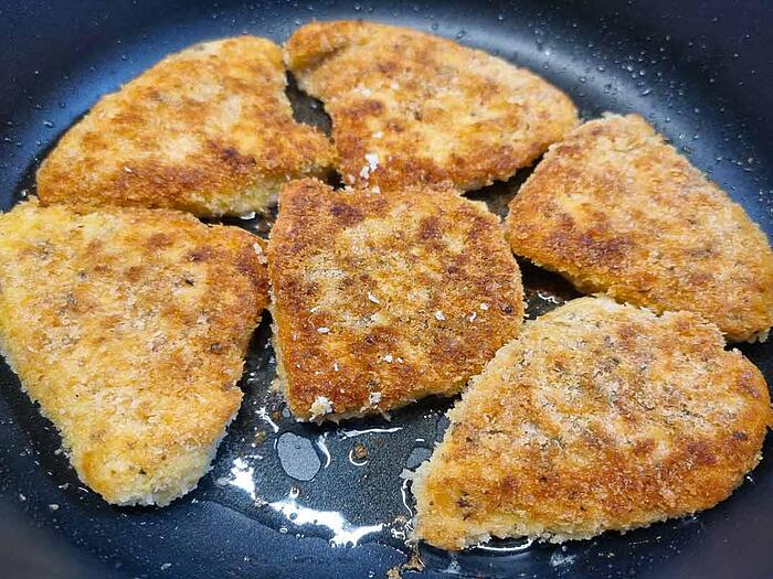 - Anschließend eine Panier-Straße aus Mehl, verquirltem Ei und Semmelbröseln vorbereiten. In dieser Reihenfolge die Hähnchenschnitzel nacheinander zuerst im Mehl, dann in den Eiern und zum Schluss in den Semmelbröseln wenden. Nach Belieben können die Semmelbrösel auch mit Zitronenschale oder andere Gewürze verfeinert werden oder durch Cornflakes-Brösel ersetzt werden.