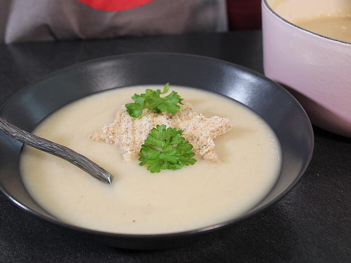 - Die Butter und das Öl gemeinsam in einen Topf geben und erhitzen. Den Knoblauch und die Zwiebeln hinzugeben und anbraten. Dann Sellerie, Karotten und Kartoffeln unterrühren und circa 2 Minuten anbraten. Anschließend die Bohnen hinzugeben und weitere 2 Minuten braten. Zum Schluss noch die Zucchini zugeben und auch 2 Minuten anbraten.