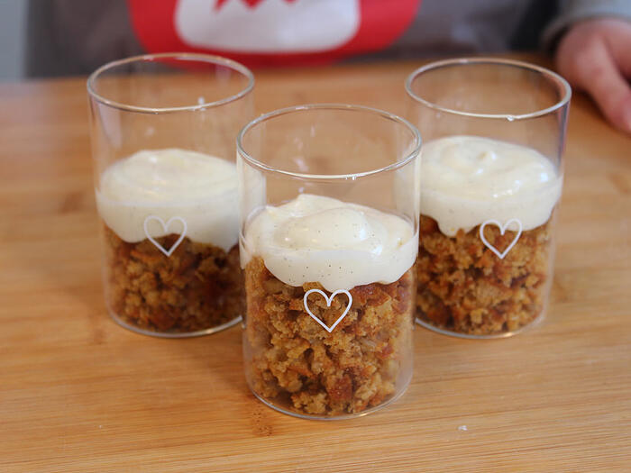 - In die Gläser zuerst die Karottenkuchen-Krümel einfüllen und oben drauf eine Schicht Frischkäse-Frosting. Oder abwechselnd eine Schicht Karottenkuchen-Krümel und eine Schicht Frischkäse-Frosting einfüllen, bis die Gläser gefüllt sind. Die oberste Schicht sollte allerdings das Frischkäse-Frosting sein.