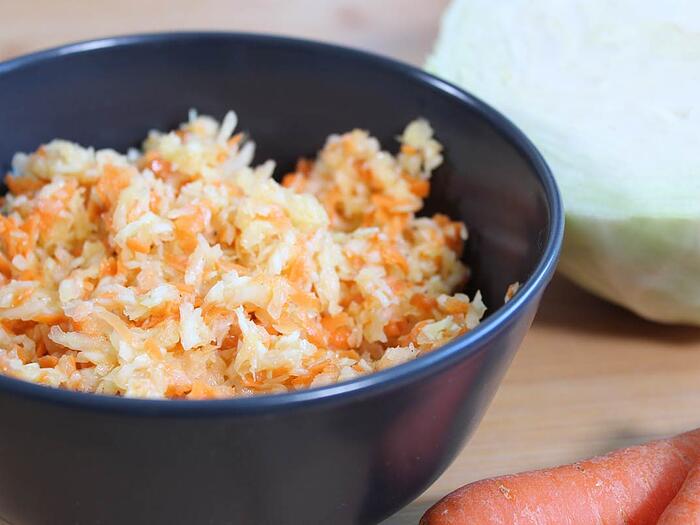 - Zuerst das Weißkraut und die Karotten hobeln und in eine große Schüssel geben.