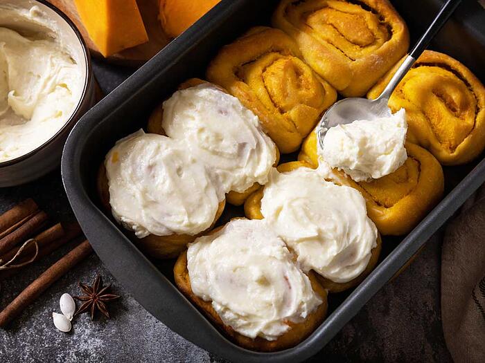 Kürbis-Zimtschnecken mit Frischkäse-Frosting